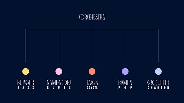 De Orchestra nacen cinco marcas con especialidades diferentes: Burger Jazz, Nami-Nori Blues, Tacos Coyotl, Ramen Pop y Coquelet Chanson, cinco restaurantes que se inspiran en la historia de la música de los lugares donde estos platos fueron creados y amados para componer Orchestra; una sola banda, muchas melodías.