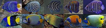 Imagen 1.- Esta serie de fotografías (reunida por el autor a partir de varias fuentes de Internet) de peces coralinos de la familia Pomacanthidae son especies muy cercanas desde el punto de vista taxonómico. De izquierda a derecha se trata de Pomacanthus asfur (Ángel Árabe), P. imperator (Ángel emperador) P. Semicirculatus, Euxiphipops (Ángel Korán), Euxiphipops Navarkus (Ángel Regal) y E. Xanthometaphon (Ángel Cara Azul). En la parte superior están las imágenes de los organismos juveniles y en la parte inferior la librea o colorido cuando son adultos. En su etapa juvenil estos peces tienen innumerables predadores y adoptan una coloración críptica y al crecer y empezar a reproducirse cambian a una coloración distintiva, notoria y de identificación de su especie que le proporciona una identidad a cada especie, para evitar las eventuales hibridaciones.