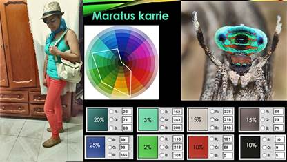 Imagen 3.- Aquí se muestra una de las diapositivas de los trabajos realizados por una de las alumnas (Edth Peñafiel Hernández), en 2019 en donde aparece el círculo cromático normalizado la búsqueda de la posible coincidencia en alguna de las propuestas de los teóricos del color la codificación del color (en este caso utilizando el código RGB) el organismo que se trataba de armonizar que era un arácnido y el vestuario de la alumna coincidiendo tratando de lograr la misma cromática.