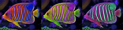 Imagen 5.- En esta fotografía se ilustra un pez corlalino denominado Pygoplites diacantus (pez Angel Real). A la derecha se ilustra con sus colores naturales y al centro y a la izquierda con los tonos manipulados con el control de tonos del programa Photoshop mostrando como sobre todo en la ilustración de la derecha se pierde la armonía y en las evaluaciones que se hace ante el grupo se considera que de repente se produce una disonancia cromática como los mismos alumnos la han dado en llamar.