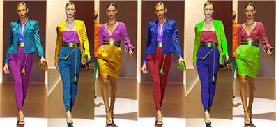 Imagen 6.- A la derecha 3 diseños de moda donde el diseñador Jan Paul Gaulthier quien aplicó el precepto de colores equidistantes en el Círculo Cromático y a la derecha se recorrieron los colores con el control de tono de Photoshop y se mantiene la armonía cromática y se conserva la triada de colores.